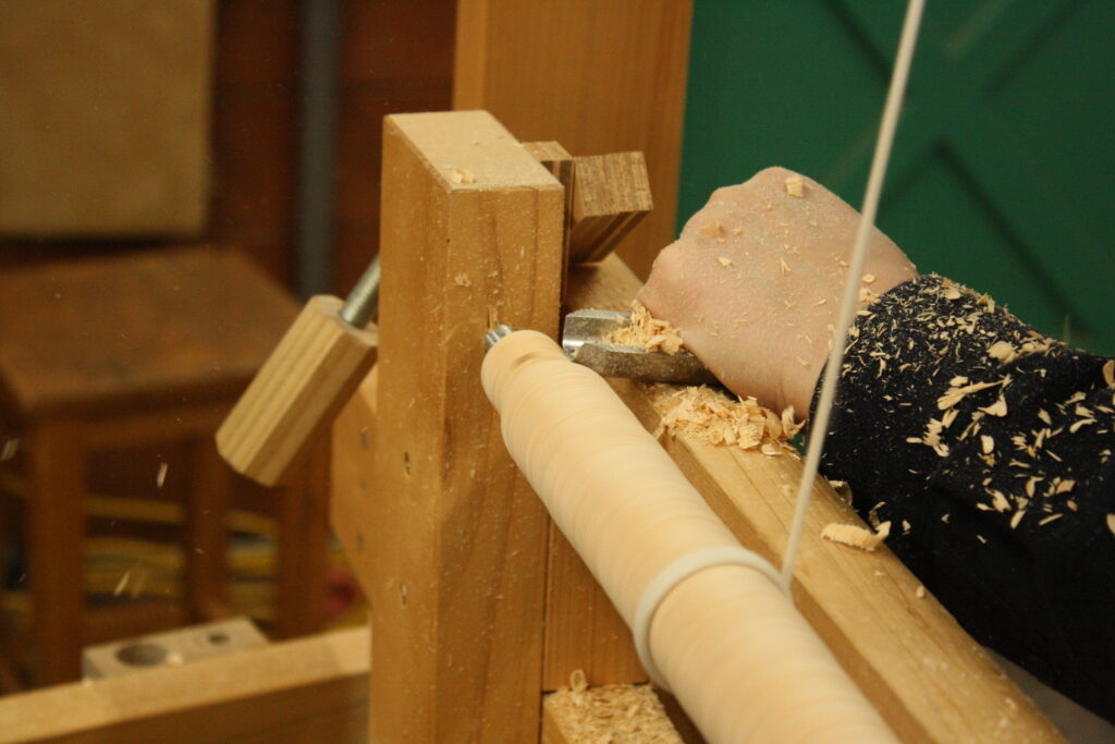 脚の材料を足踏みロクロを使って削ります。今回はヒノキ材を使用しました。脚をつくるのに決まっていることは板に差し込む部分の径と長さだけ。それ以外は自由。まっすぐの脚や先すぼみの脚、うねうねとウェーブした様な脚もありました。