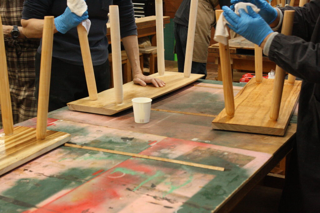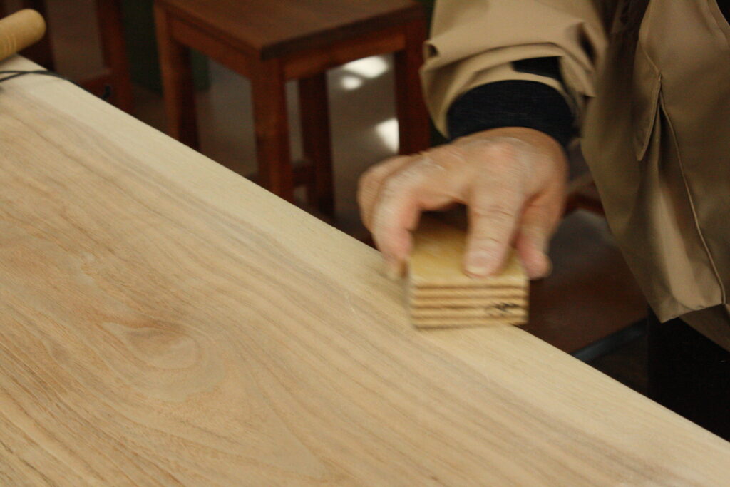 最後にヤスリがけをして塗装をします。塗装をすると濡れ色に仕上がり、選んだ板の良さがより引き立ちますね。