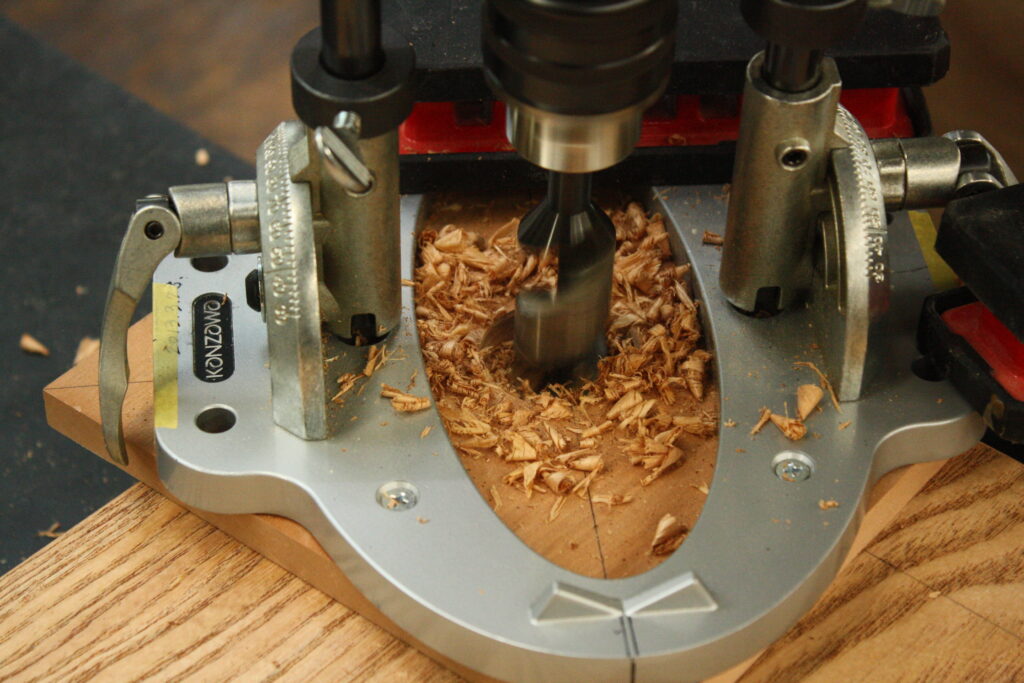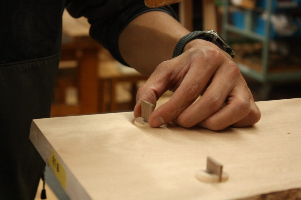 選んできた板材に脚を差し込む穴を空けます。まっすぐに空けるのでは無く、少し角度のついた穴を空ける必要があったので微調整に苦労しましたね。