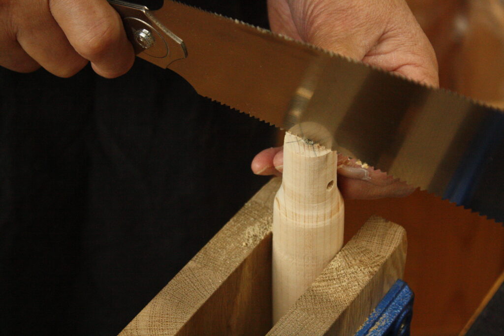 穴空けが完了したら脚を差し込み、しっかり組めるか確認をします。接着前には必ずクサビを打ち込む溝を鋸でつくっておきます。溝が無いとクサビも入らないですからね。