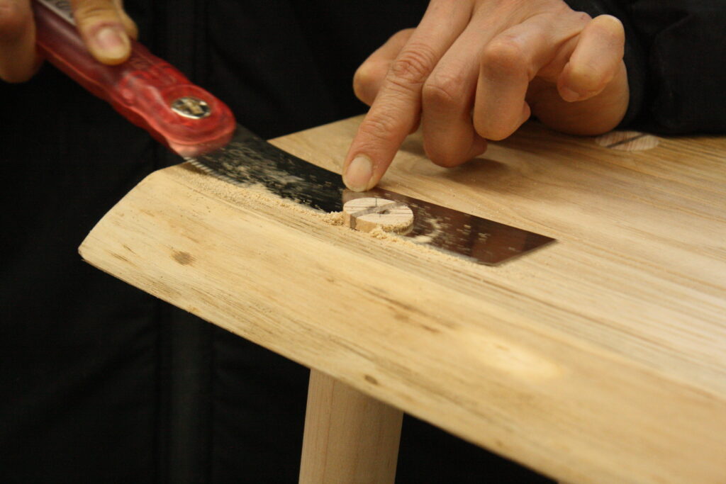 穴に脚が入ることが確認できたら接着をします。脚の材に接着剤を塗り、穴に差し込みます。向きに気を付けてクサビを打ち込み脚を固定します。少し時間をおいてから鋸で余分に飛び出たところを座面に傷がつかない様に慎重に切ります。