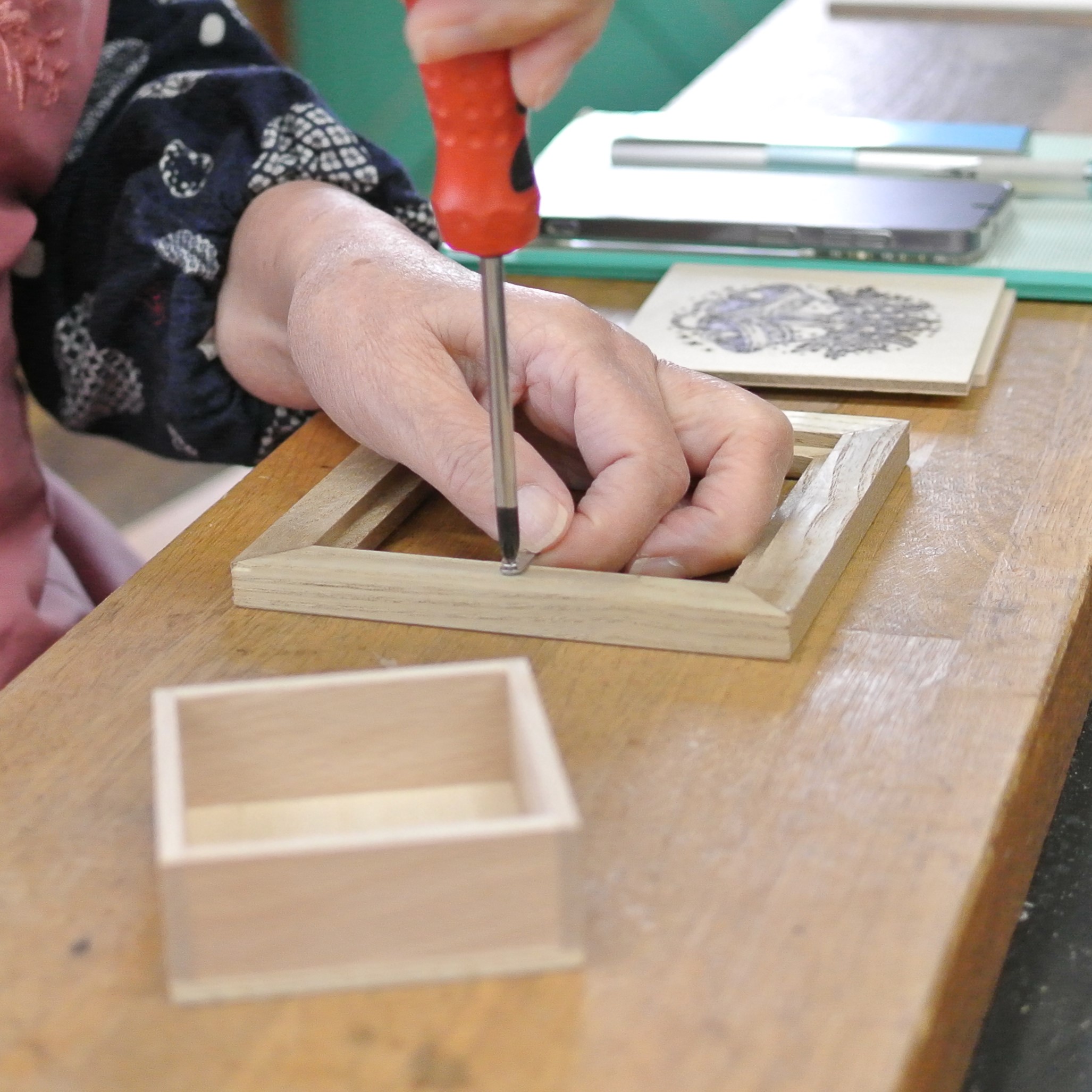 100mm×100mmの板材に、焼きペンを使って絵や模様などを描く「ウッドバーニング」を楽しみます。併せて、ちょこっと木工体験として額縁も制作します。