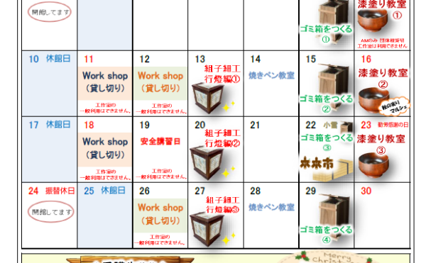 NEW 2025年10月29日おしらせadmin 11月の工作室ご利用について (10月29日現在)いつも丹波年輪の里をご利用いただき誠にありがとうございます。下記の日程は、工作室をご利用いただけません。 11月 1日(土) 終日 *イベントのため 11月 2日(日) 終日 *イベントのため 11月 9 […]