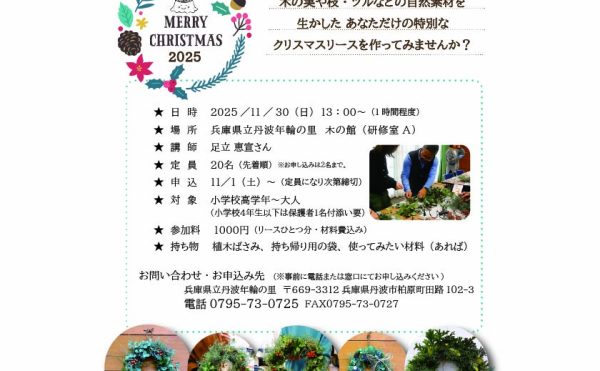 NEW 2025年10月21日おしらせnenrin クリスマスリース教室参加者募集木の実や枝・ツルなどの自然素材を生かした あなただけの特別なクリスマスリースを作ってみませんか? ★ 日 時 2025年11月30日(日) 13:00~(1時間程度)★ 場 所 兵庫県立丹波年輪の里 木の館(研修室A […]